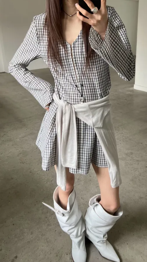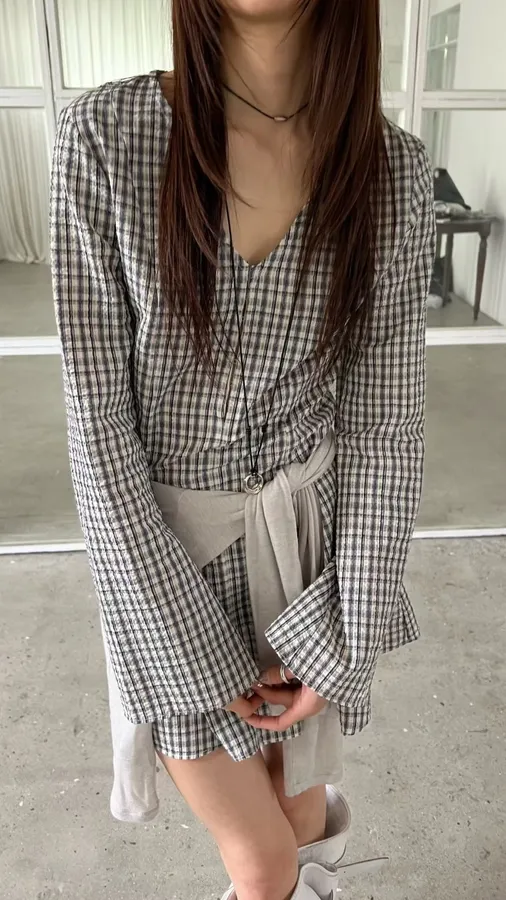 H420 女神袖V領格紋洋